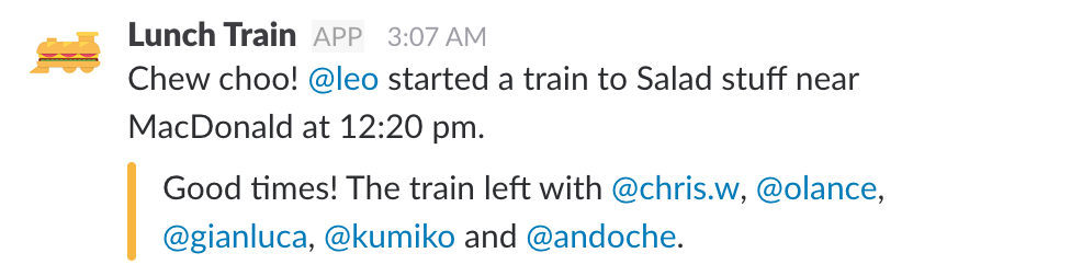 Our Paris team eats lunch together every single day. Instead of getting catered food like you might be accustomed to in the U.S., our engineers and team have their meals sponsored by Algolia. This means that every day in Slack, you’ll get a message like the one below saying where everyone’s headed for lunch. Use your food vouchers and get on the lunch train!