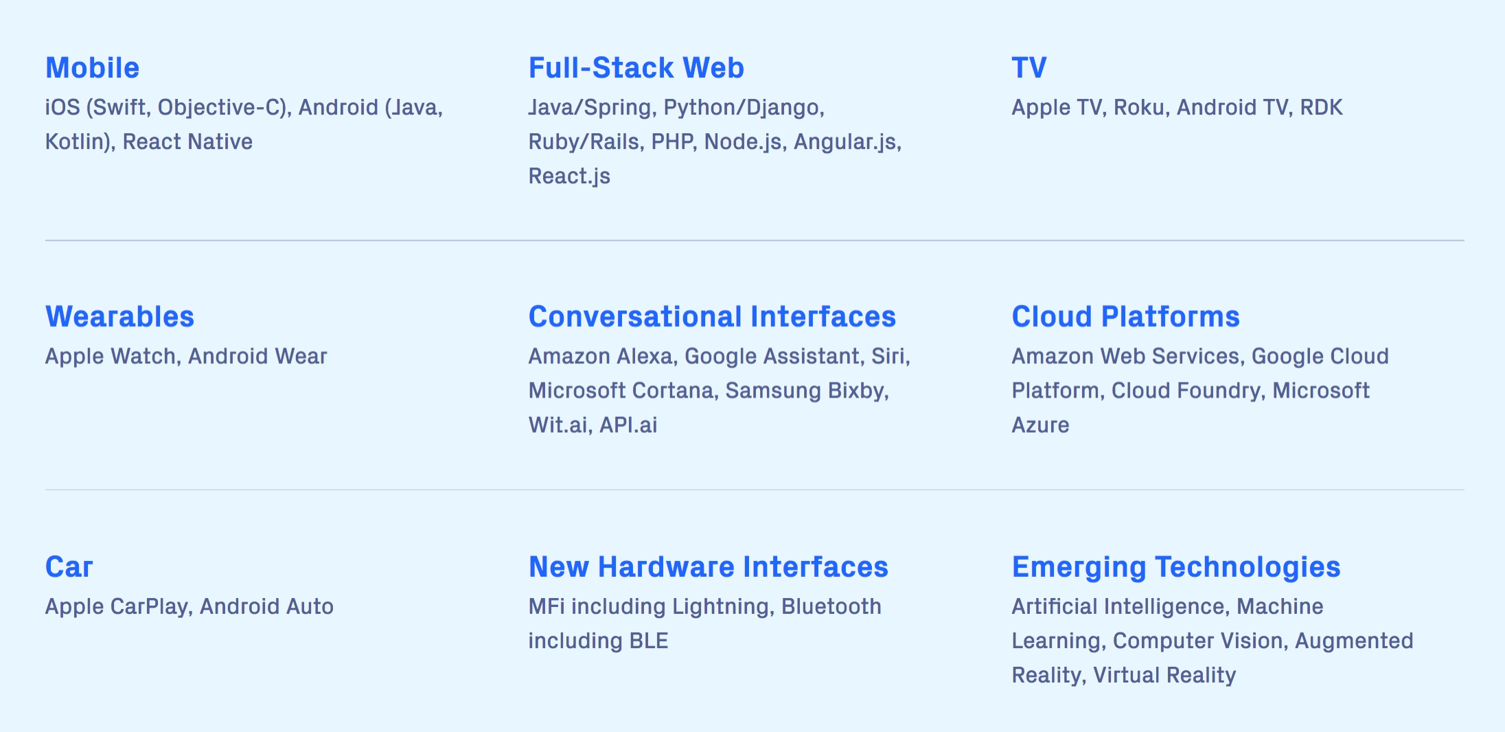 Software for new hardware is what we do best, and our engineering team is constantly experimenting with new technologies. Currently, our team is excited to work on CUI and VUI projects and expand our AI/ML practice. We are working very closely with industry AR/VR leaders and undertaking interesting and unique applications of these technologies. For a full list of the technologies we work with, scroll through to Where We Play on our website.