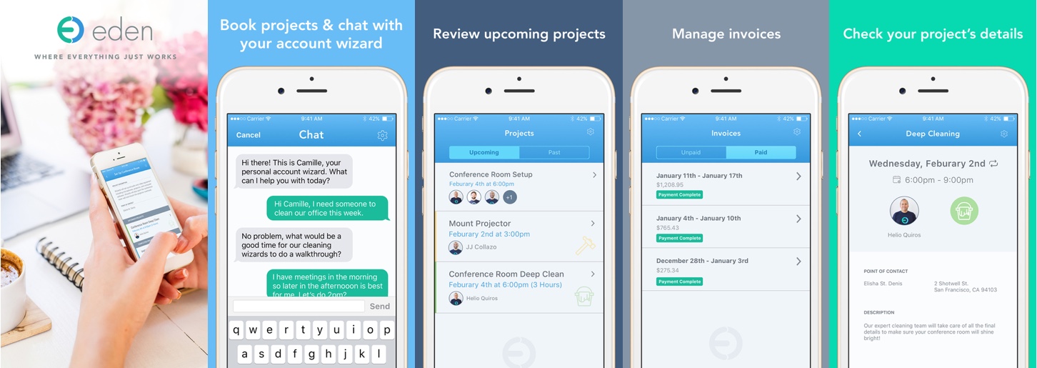 We are currently a 25-person company and plan to double our headcount in the coming year. It is a very special and exciting time to join Eden. This next chapter for us will let you see exactly how a company scales and orchestrates several moving parts. Eden is building a marketplace for the office and a suite of software so that people can run their offices more efficiently, which in turn creates an incredible amount of surface area. We will be entering new cities and building a number of new products including a ticketing service for office managers and Native apps for our Wizards, service workers, and clients (just to name a few). We are looking for full-stack engineers who want to build this company with us. If you want to learn more, shoot us an email!